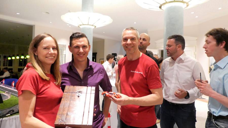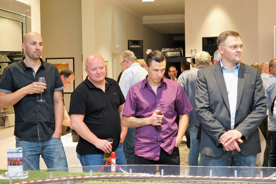 Nachdem der offizielle Teil der Eröffnung, der unter anderem auch die Präsentation der neuesten Produkte (Rückfahrkamerasysteme, Seitenmarkierungsleuchten, Elektrobedarf etc.) beinhaltete, mit dem nötigen Respekt absolviert worden war, kamen auch der Spaß und die Unterhaltung nicht zu kurz. Beim abschließenden Rennen auf der Carrerabahn wurden auch die "großen Jungs" wieder ganz klein und lieferten sich atemberaubende Geschwindigkeitsduelle. Sascha und Hans-Jürgen konnten sich schließlich mit Können und Taktieren gegen die "Gegner" durchsetzen und erzielten unter großem Applaus den 1. und 2. Rang! Auch wir gratulieren Ihnen natürlich zu diesem tollen Ergebnis:-)