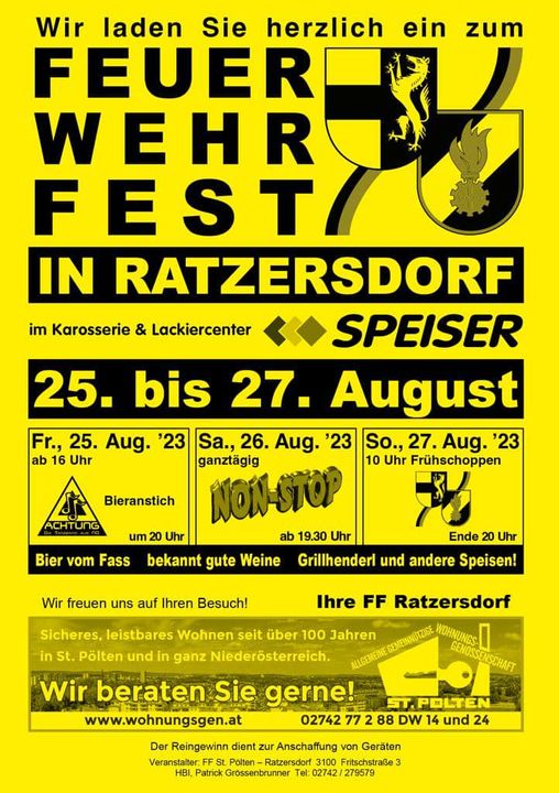 Wir freuen uns darauf, dass wir unser gesamtes Firmengelände der FF Ratzersdorf heuer wieder unentgeltlich zur Verfügung stellen und hoffen wie immer auf ein gelungenes, erfolgreiches Fest:-)